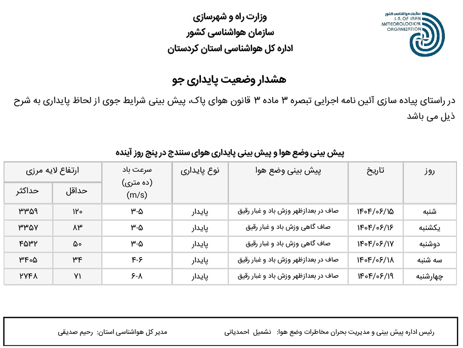 بولتن آلودگی استان کردستان؛ تاریخ صدور: شنبه 15 شهریور ماه 1404