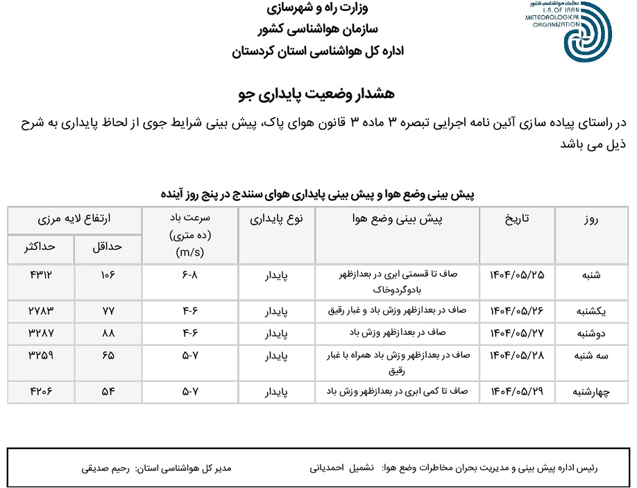 بولتن آلودگی استان کردستان؛ تاریخ صدور: شنبه 25 مرداد ماه 1404