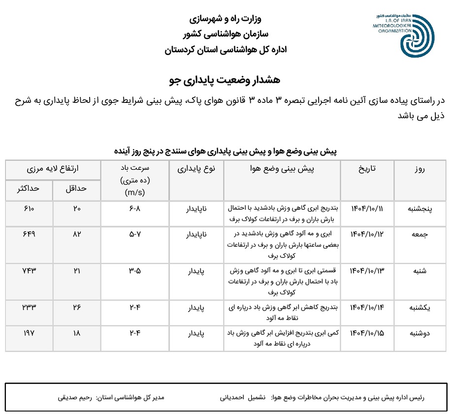 بولتن آلودگی استان کردستان؛ تاریخ صدور :پنجشنبه 11 دی ماه 1404