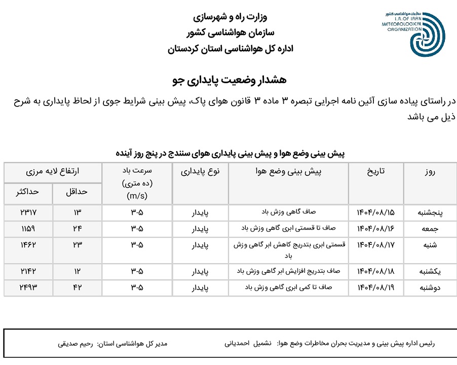 بولتن آلودگی استان کردستان؛ تاریخ صدور : پنجشنبه 15 آبان ماه 1404