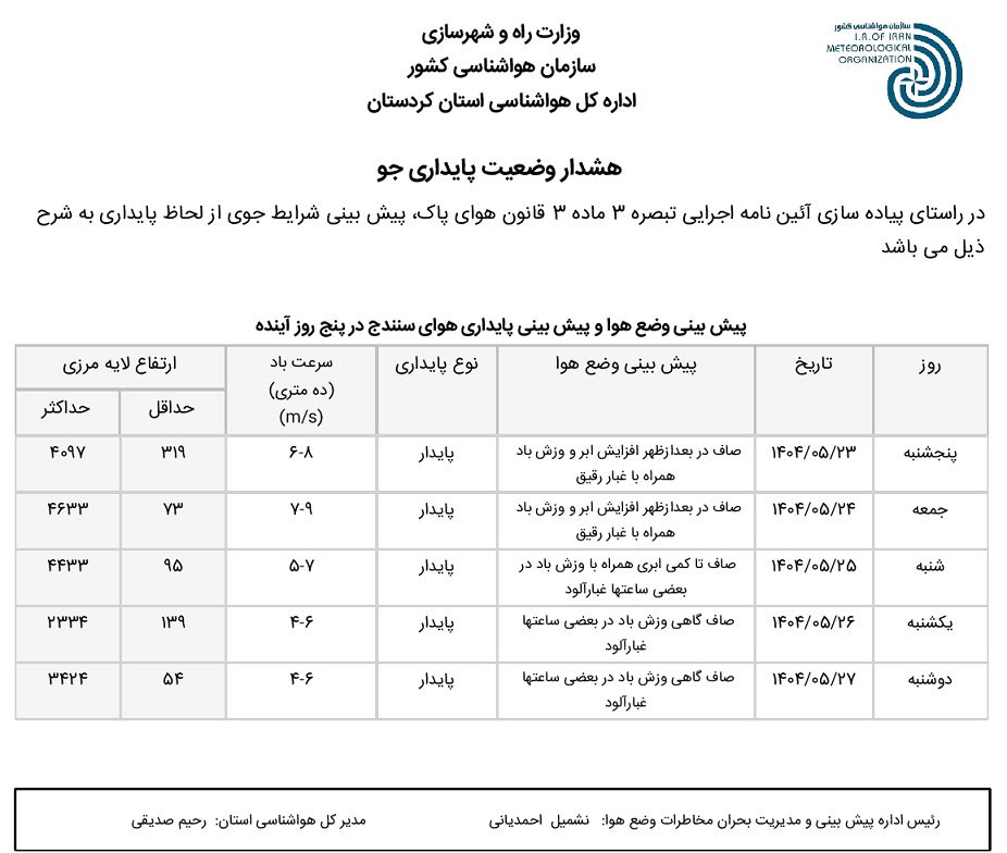 بولتن آلودگی استان کردستان؛ تاریخ صدور: پنجشنبه 23 مرداد ماه 1404