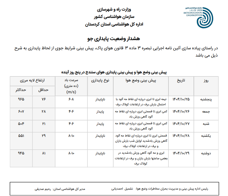 بولتن آلودگی استان کردستان؛ تاریخ صدور : پنجشنبه 25 دی ماه 1404