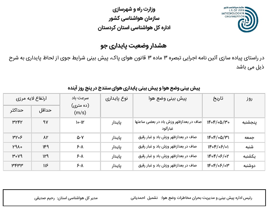 بولتن آلودگی استان کردستان؛ تاریخ صدور: پنجشنبه 30 مرداد ماه 1404