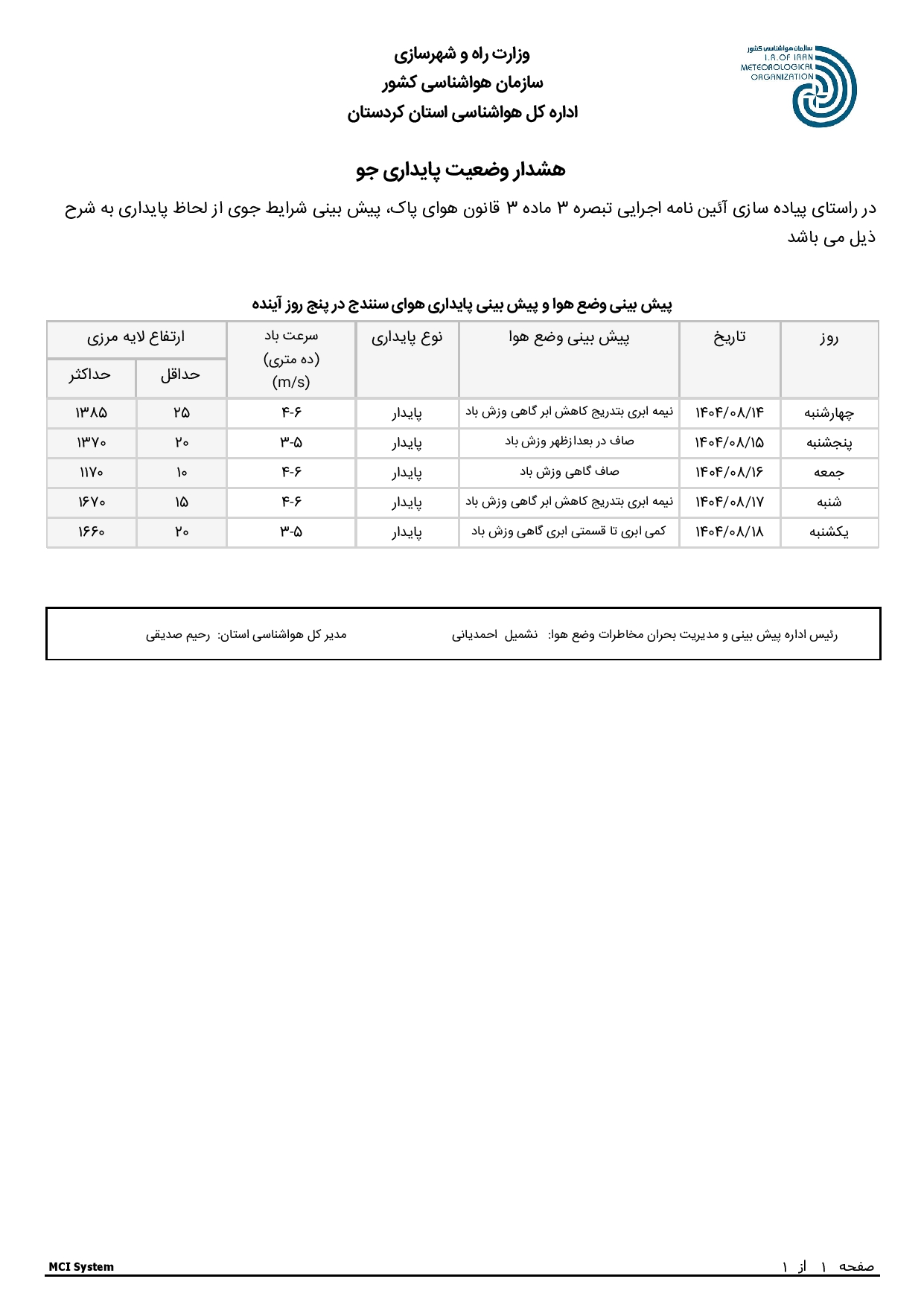 بولتن آلودگی استان کردستان؛ تاریخ صدور : چهارشنبه 14 آبان ماه 1404