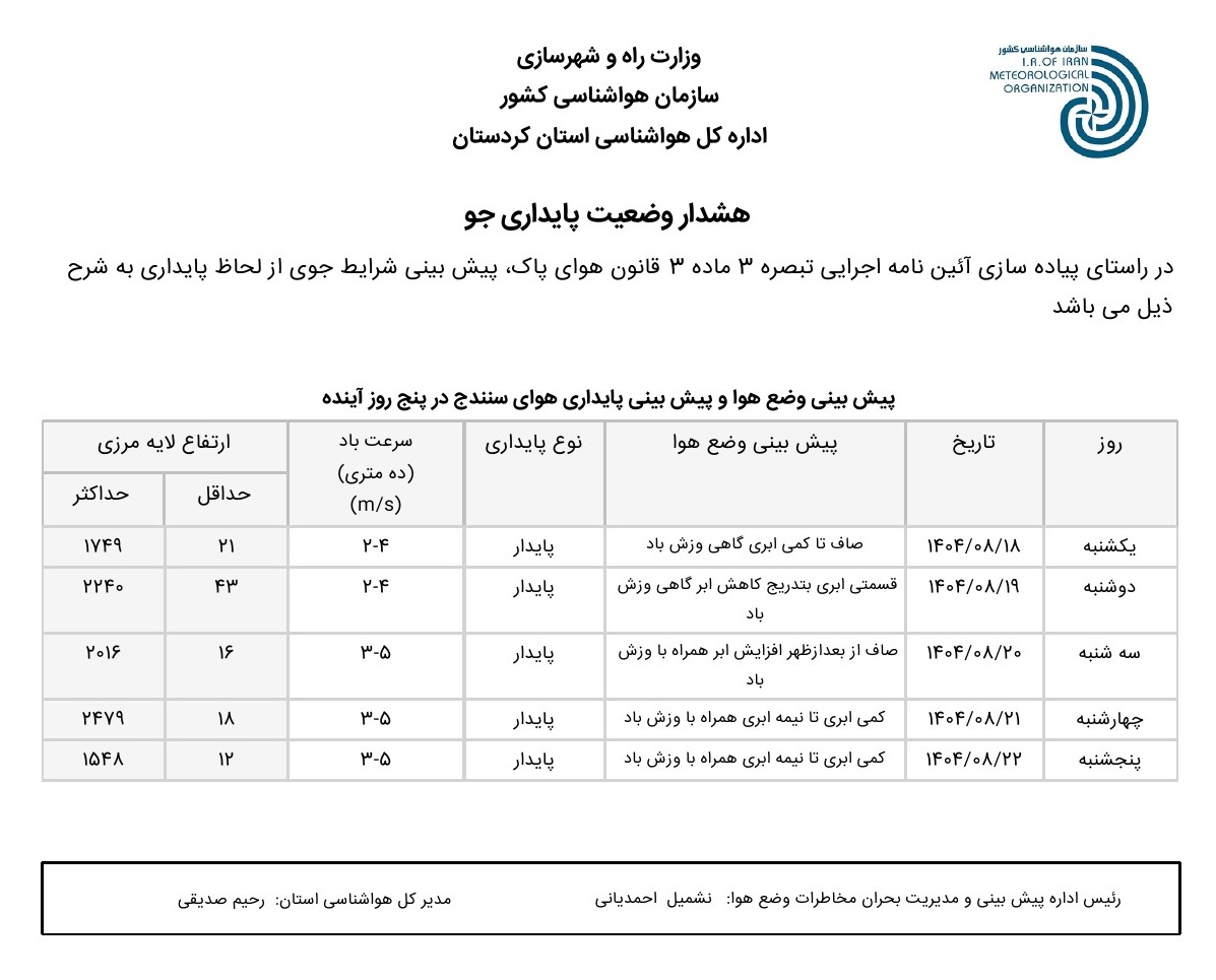 بولتن آلودگی استان کردستان؛ تاریخ صدور : یکشنبه 18 آبان ماه 1404