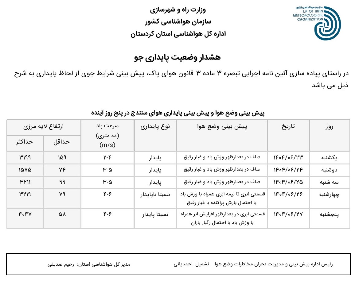 بولتن آلودگی استان کردستان؛ تاریخ صدور: یکشنبه 23 شهریور ماه 1404