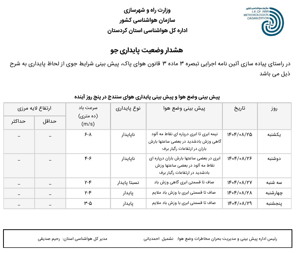 بولتن آلودگی استان کردستان؛ تاریخ صدور : یکشنبه 25 آبان ماه 1404