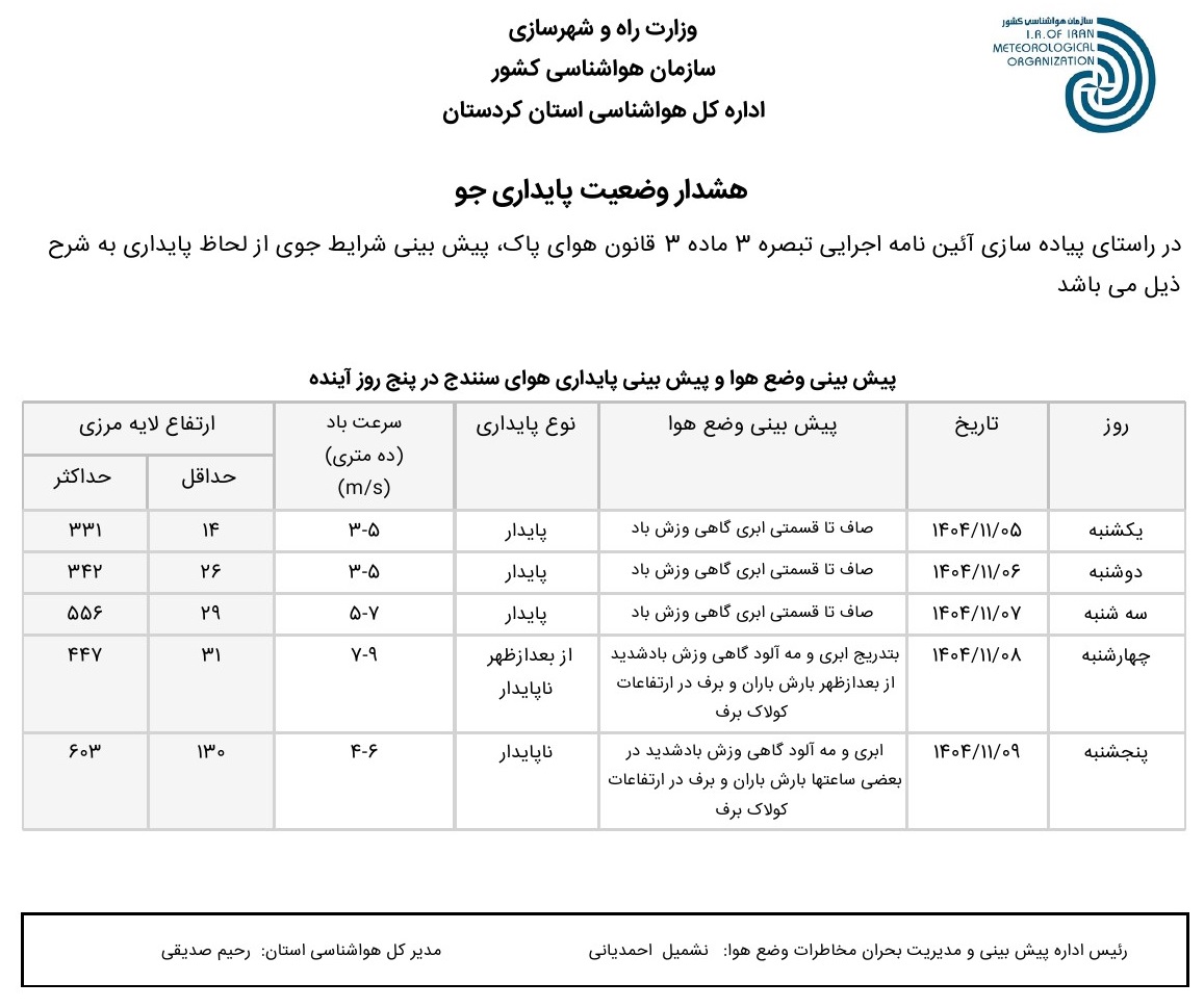 بولتن آلودگی استان کردستان؛ تاریخ صدور : یکشنبه 5 بهمن ماه 1404