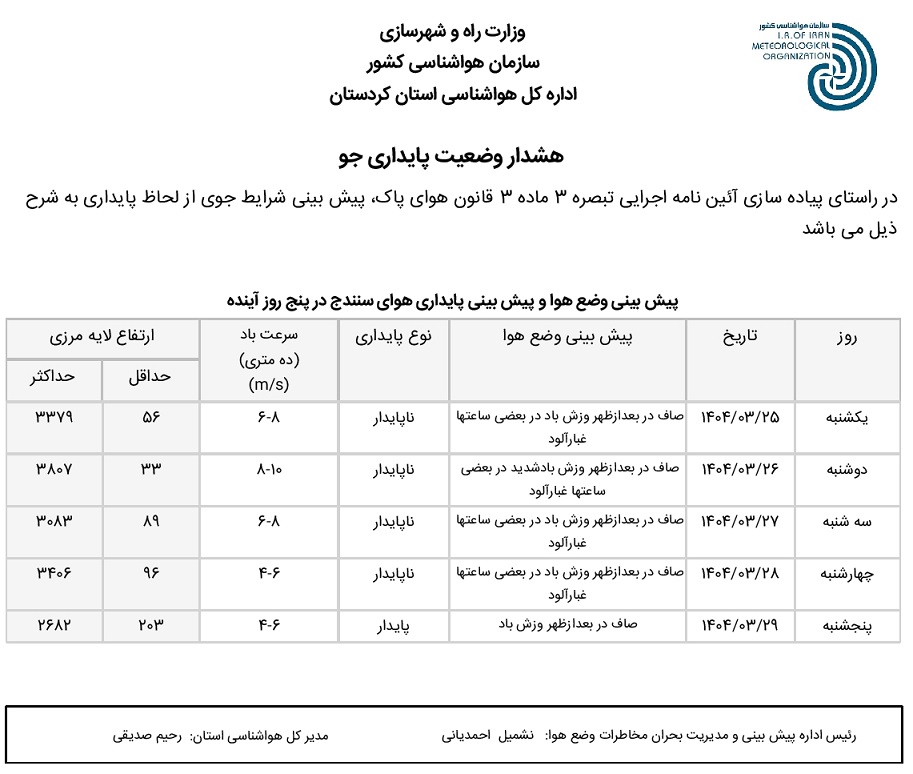 بولتن آلودگی هوای استان کردستان؛ تاریخ صدور: یکشنبه 25 خرداد ماه 1404