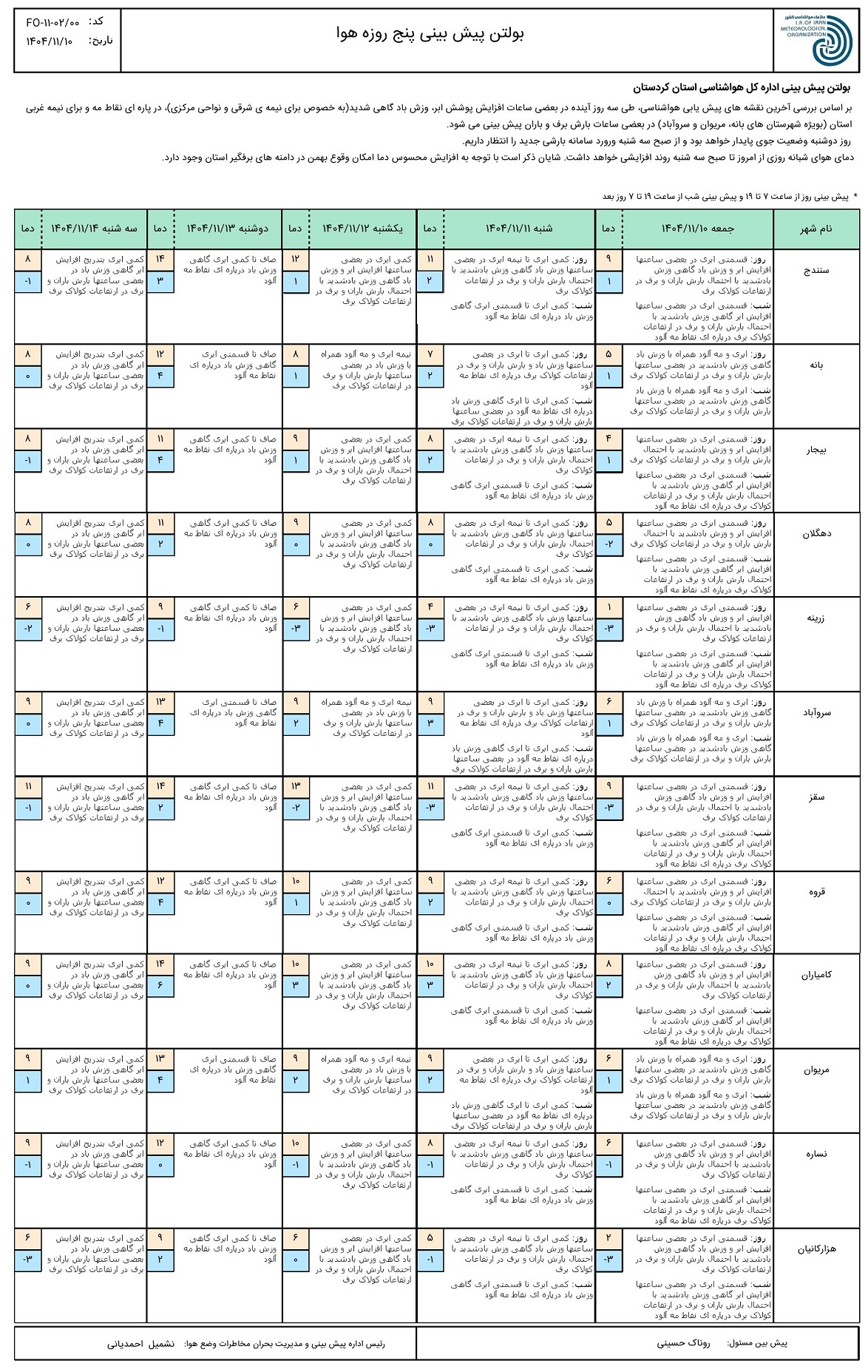 بولتن پیش بینی پنج روزه وضع هوای استان کردستان، تاریخ صدور: جمعه 10 بهمن سال 1404