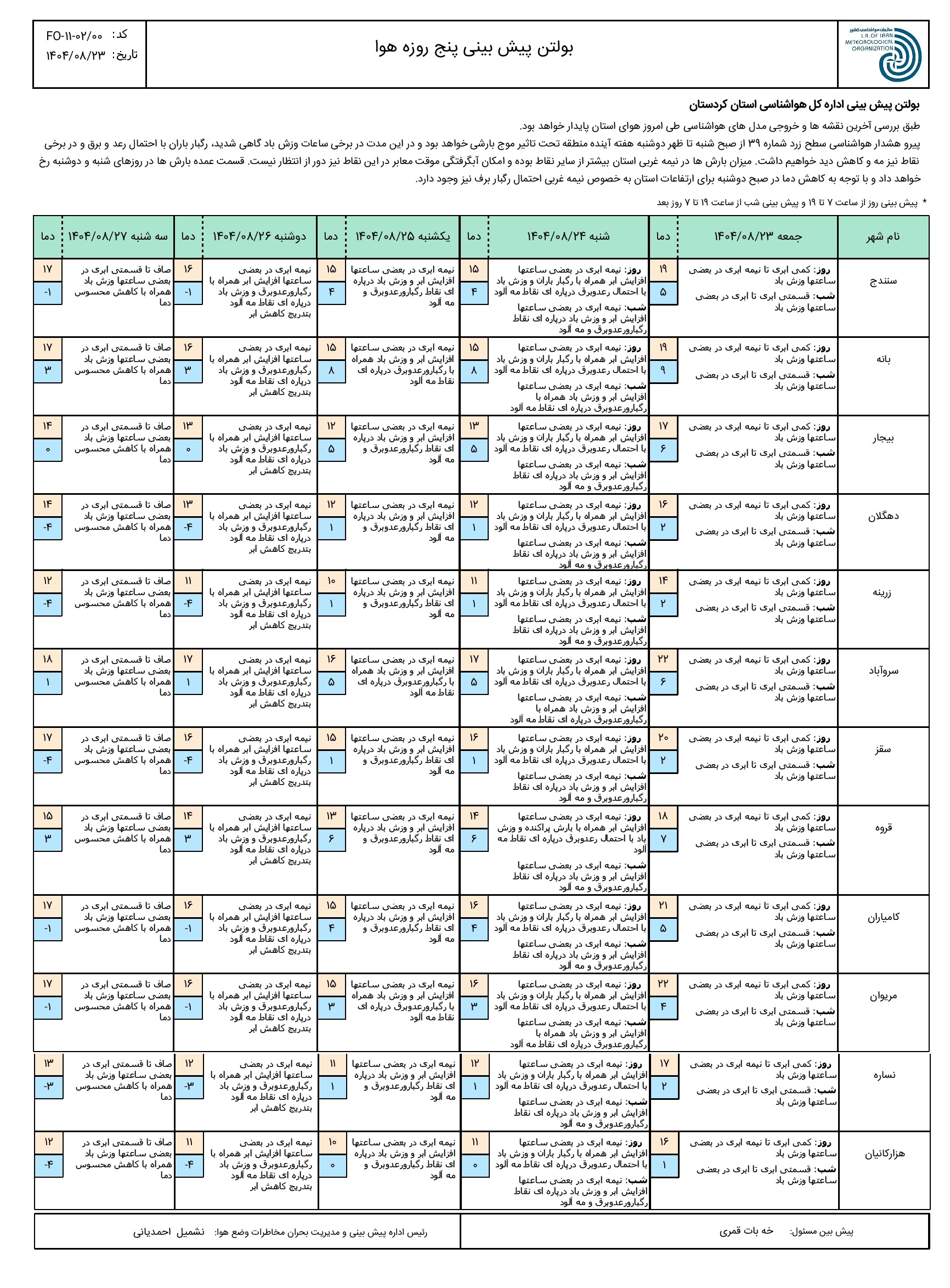 بولتن پیش بینی پنج روزه وضع هوای استان کردستان؛ تاریخ صدور: جمعه 23 آبان ماه 1404