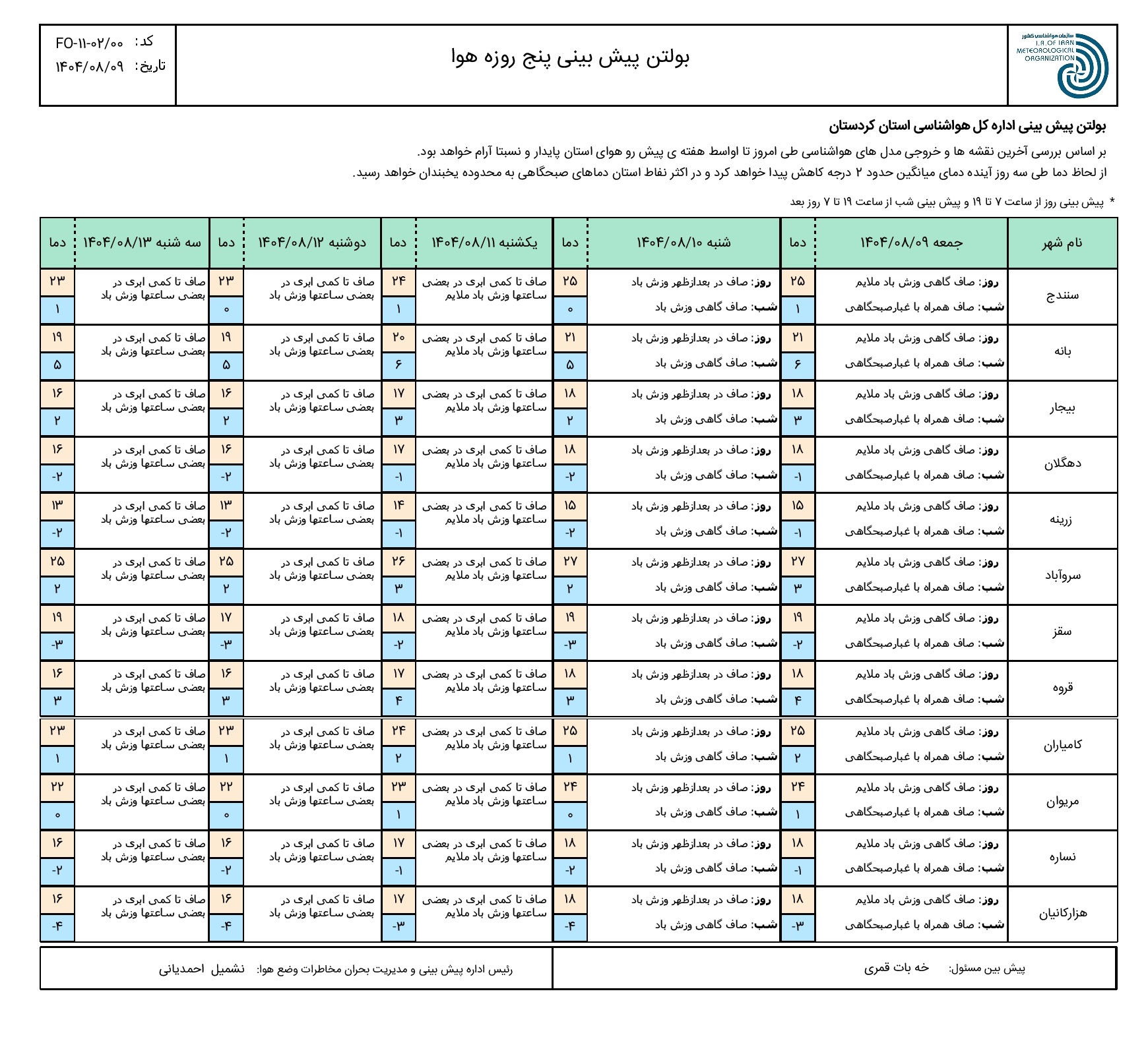 بولتن پیش بینی پنج روزه وضع هوای استان کردستان؛ تاریخ صدور: جمعه 9 آبان ماه 1404