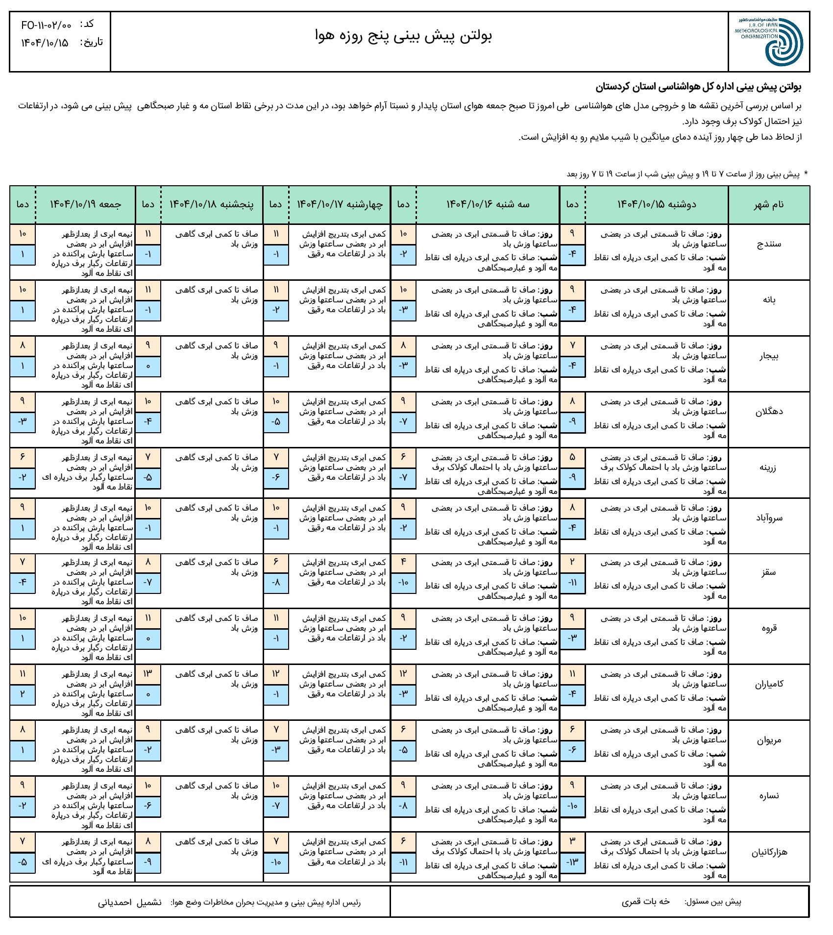 بولتن پیش بینی پنج روزه وضع هوای استان کردستان؛ تاریخ صدور: دوشنبه 15 دی ماه 1404