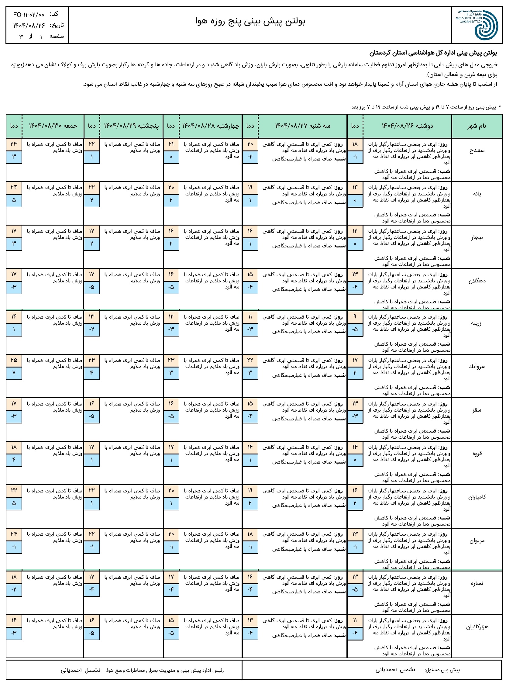 بولتن پیش بینی پنج روزه وضع هوای استان کردستان؛ تاریخ صدور: دوشنبه 26آبان ماه 1404