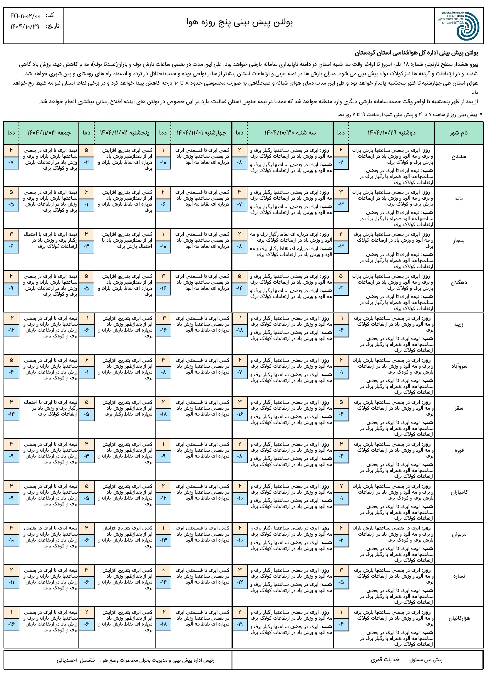بولتن پیش بینی پنج روزه وضع هوای استان کردستان؛ تاریخ صدور: دوشنبه 29دی ماه 1404