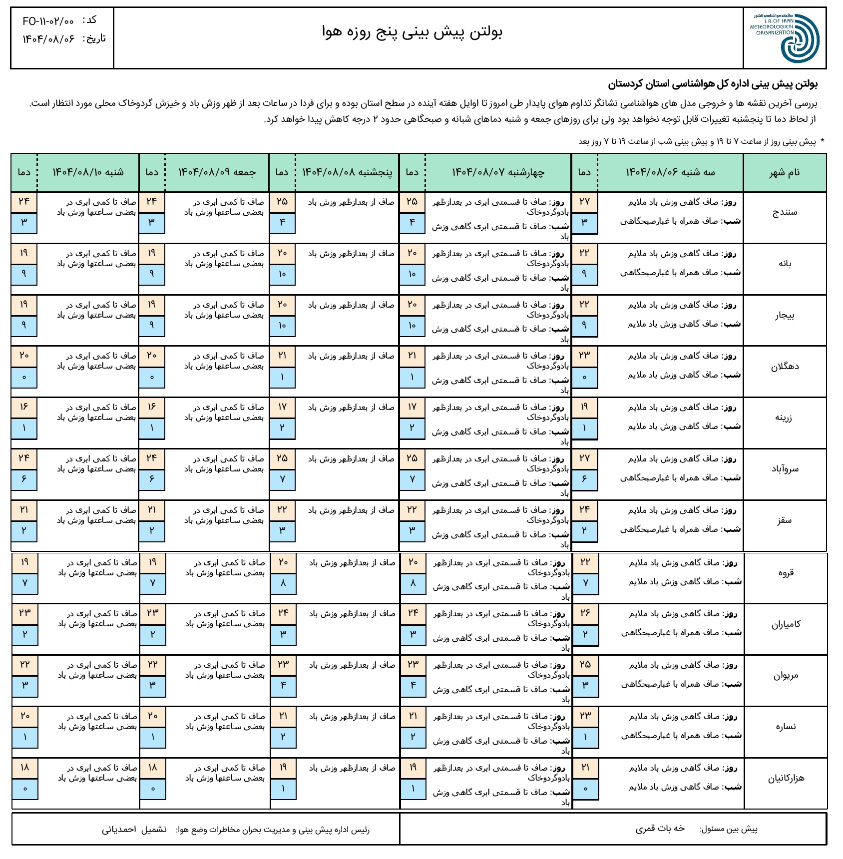 بولتن پیش بینی پنج روزه وضع هوای استان کردستان؛ تاریخ صدور: سه شنبه 6 آبان ماه 1404