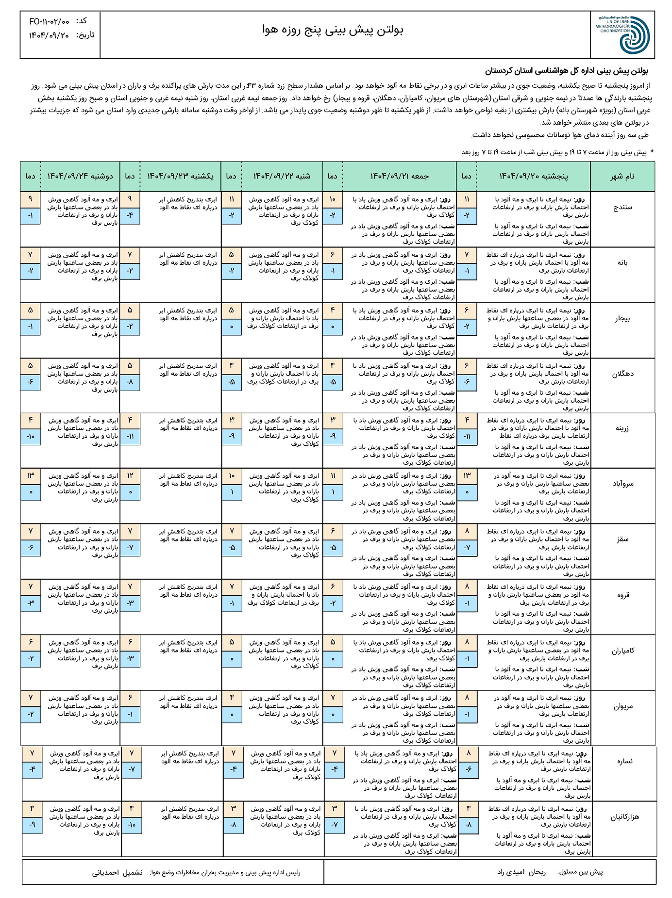 بولتن پیش بینی پنج روزه وضع هوای استان کردستان؛ تاریخ صدور: پنجشنبه 20آذر ماه 1404