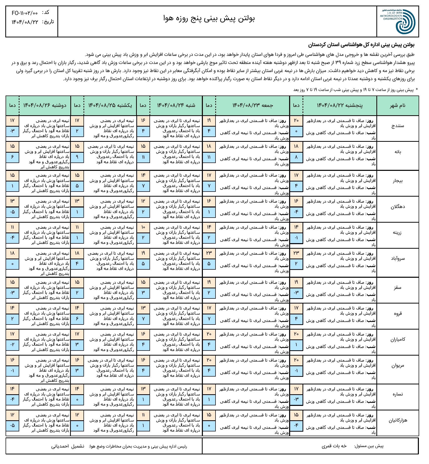 بولتن پیش بینی پنج روزه وضع هوای استان کردستان؛ تاریخ صدور: پنجشنبه 22 آبان ماه 1404