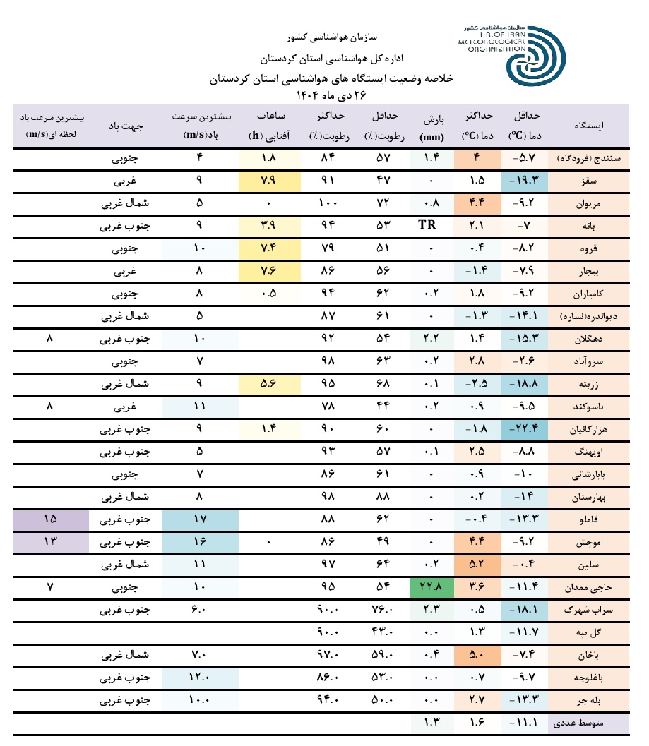 خلاصه وضعیت ایستگاه های هواشناسی استان کردستان در 24 ساعت گذشته؛ تاریخ تهیه: جمعه 26 دی ماه 1404