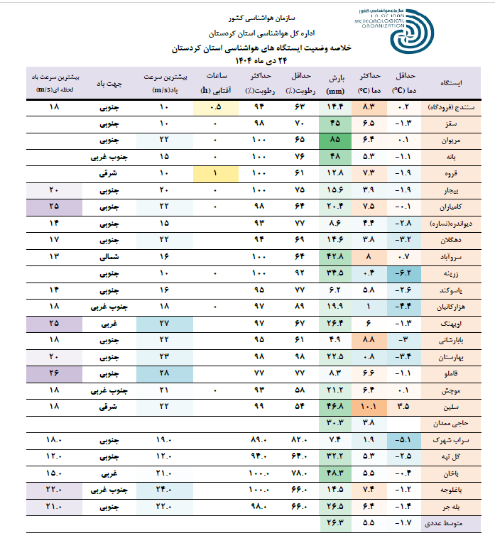 خلاصه وضعیت ایستگاه های هواشناسی استان کردستان در 24 ساعت گذشته؛ تاریخ تهیه: چهارشنبه 24 دی ماه 1404