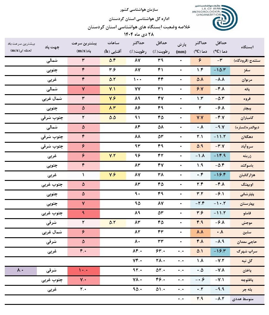 خلاصه وضعیت ایستگاه های هواشناسی استان کردستان در 24 ساعت گذشته؛ تاریخ تهیه: یکشنبه 28 دی ماه 1404