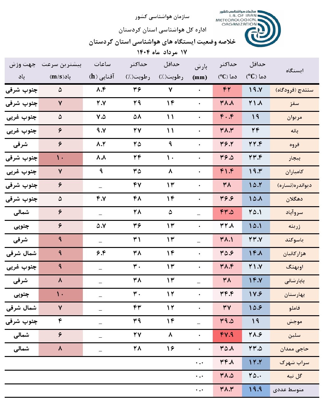 خلاصه وضعیت ایستگاه های هواشناسی استان کردستان در 24 ساعت گذشته؛ تاریخ صدور: جمعه 17 مرداد ماه 1404