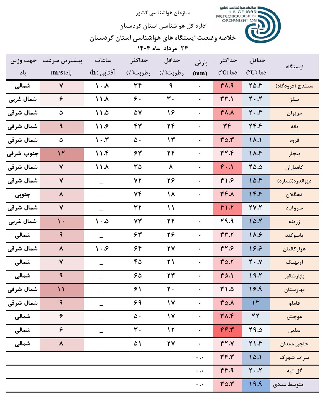 خلاصه وضعیت ایستگاه های هواشناسی استان کردستان در 24 ساعت گذشته؛ تاریخ صدور: جمعه 24 مرداد ماه 1404