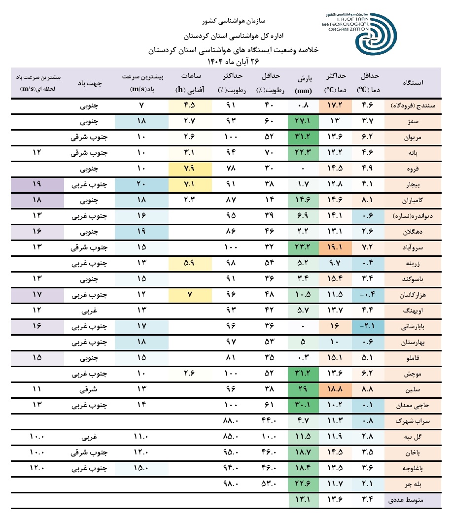 خلاصه وضعیت ایستگاه های هواشناسی استان کردستان در 24 ساعت گذشته؛ تاریخ صدور: دوشنبه 26 آبان ماه 1404