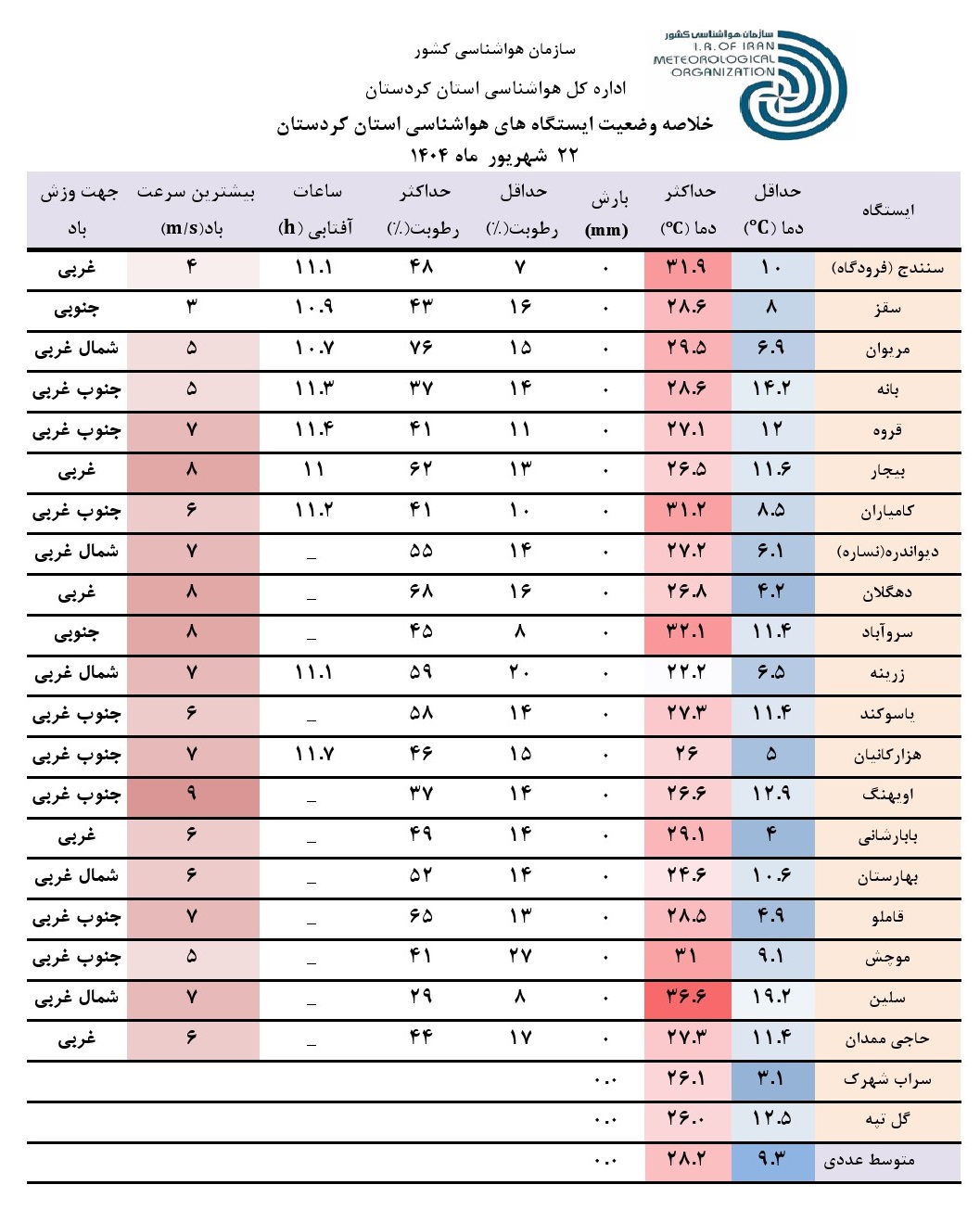 خلاصه وضعیت ایستگاه های هواشناسی استان کردستان در 24 ساعت گذشته؛ تاریخ صدور: شنبه 22 شهریور ماه 1404