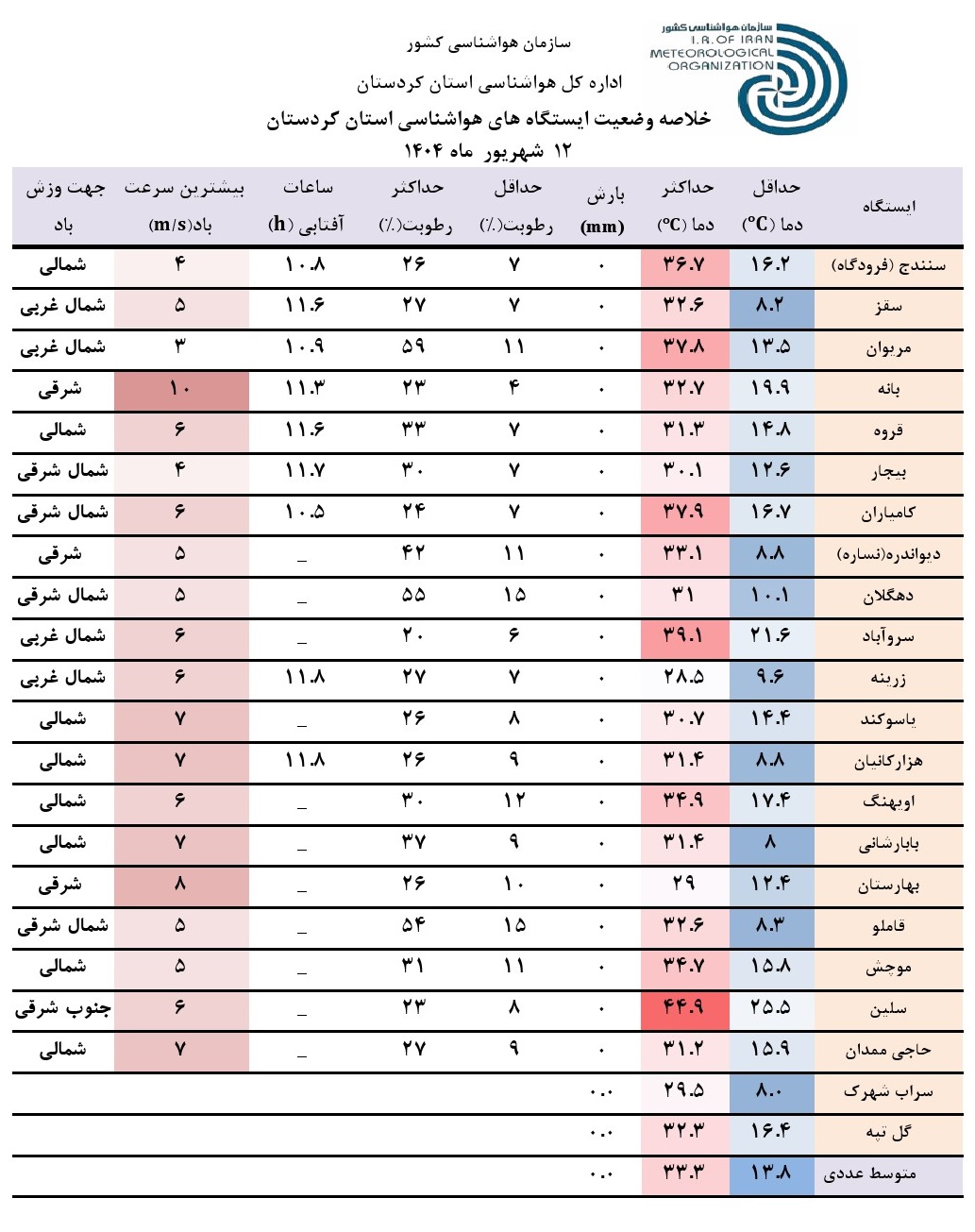 خلاصه وضعیت ایستگاه های هواشناسی استان کردستان در 24 ساعت گذشته؛ تاریخ صدور:چهارشنبه 12 شهریور ماه 1404