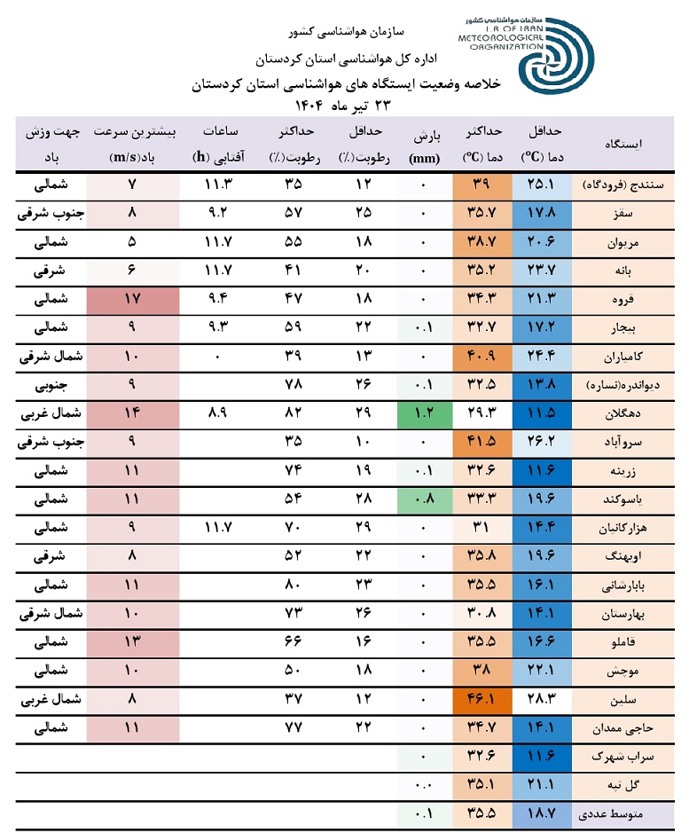 خلاصه وضعیت ایستگاه های هواشناسی استان کردستان در 24 ساعت گذشته: تاریخ تهیه: دوشنبه 23 تیر ماه سال 1404