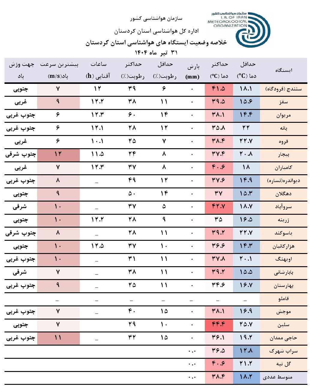 خلاصه وضعیت ایستگاه های هواشناسی استان کردستان در 24 ساعت گذشته: تاریخ تهیه: سه شنبه 31 تیر ماه سال 1404