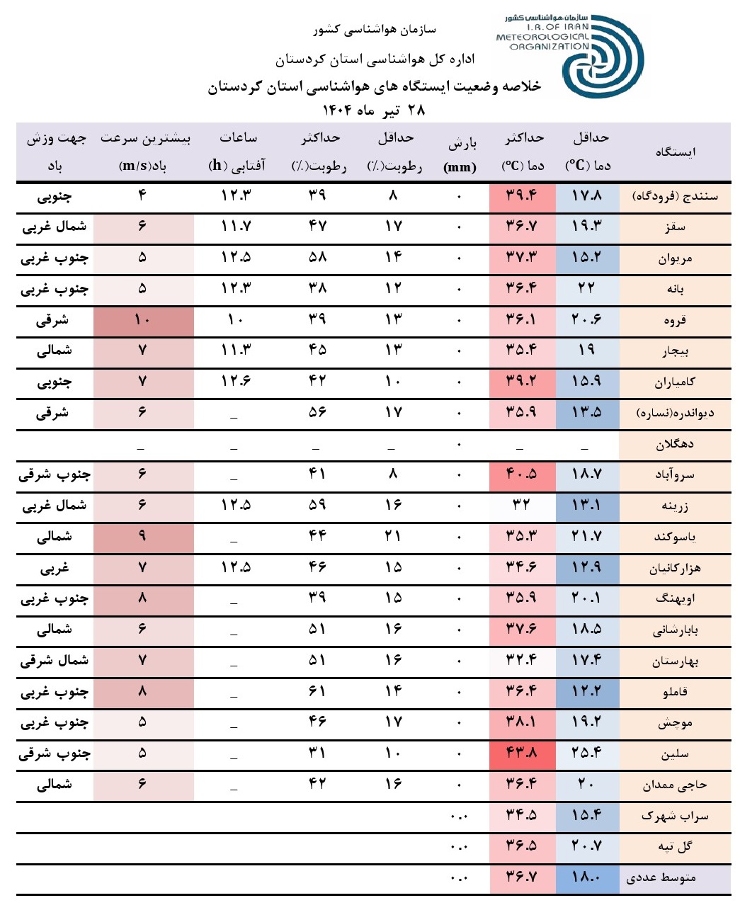 خلاصه وضعیت ایستگاه های هواشناسی استان کردستان در 24 ساعت گذشته: تاریخ تهیه: شنبه 28 تیر ماه سال 1404