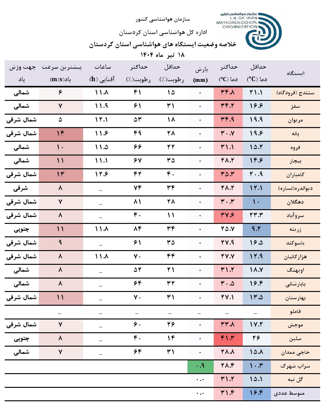 خلاصه وضعیت ایستگاه های هواشناسی استان کردستان در 24 ساعت گذشته: تاریخ تهیه: چهارشنبه 18 تیر ماه سال 1404