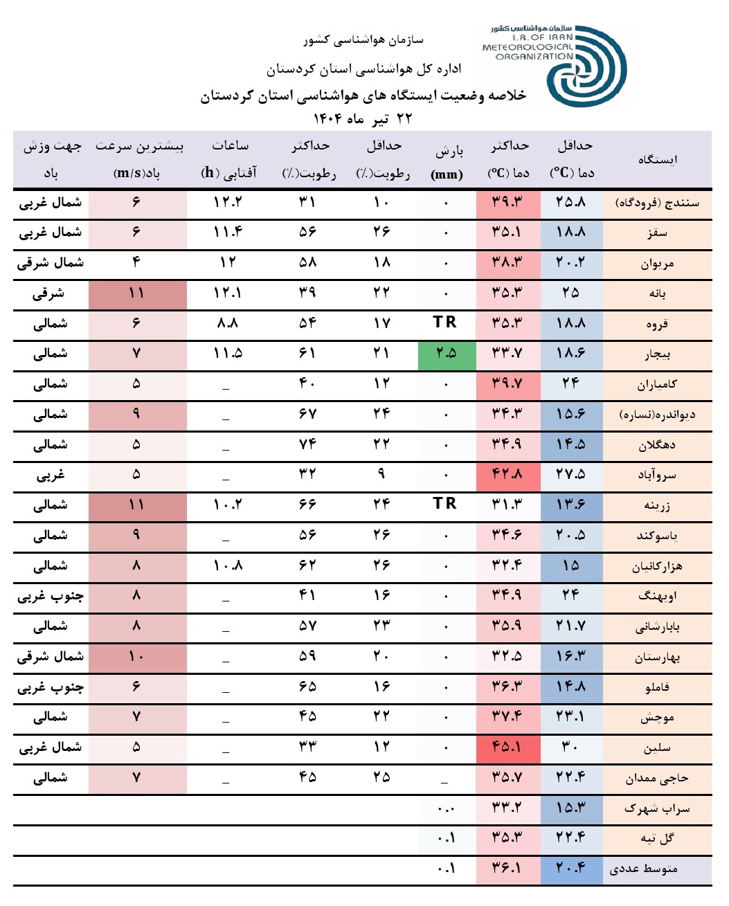 خلاصه وضعیت ایستگاه های هواشناسی استان کردستان در 24 ساعت گذشته: تاریخ تهیه: یکشنبه 22 تیر ماه سال 1404