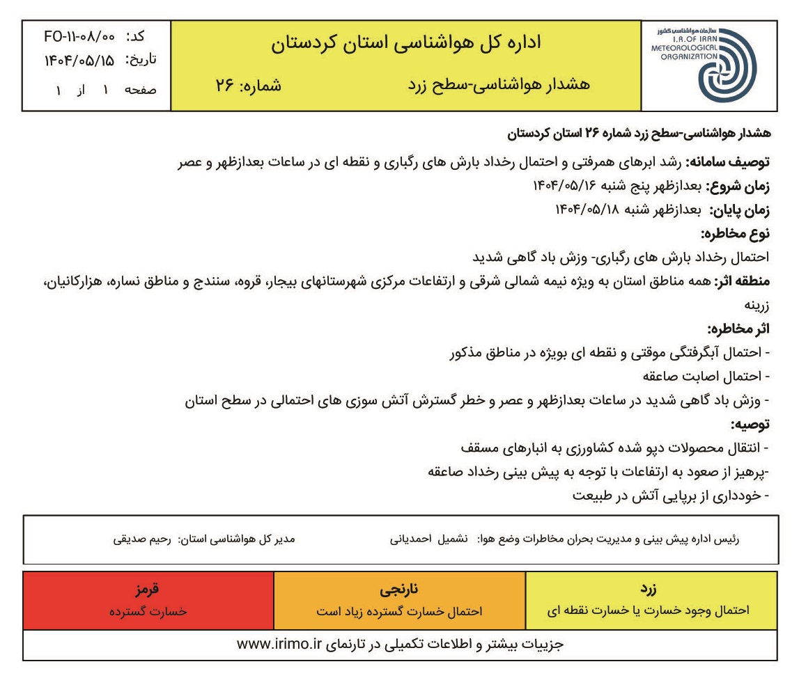 هشدار هواشناسی سطح زرد شماره 26 - رگبار و رعدوبرق پراکنده ، تداوم گرما؛ تاریخ صدور: چهارشنبه 15 مرداد ماه 1404