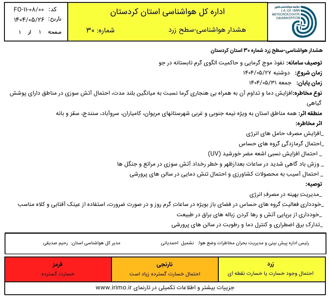 هشدار هواشناسی سطح زرد شماره 30- افزایش دما و تداوم گرما ؛ تاریخ صدور: یکشنبه 26 مرداد ماه 1404