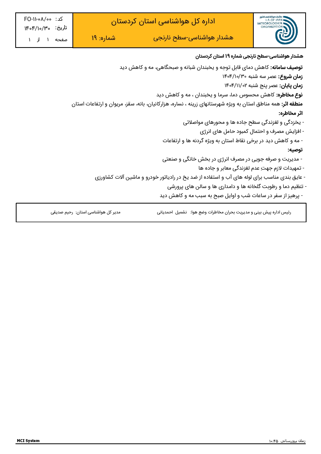 هشدار هواشناسی سطح نارنجی شماره 19- نفوذ توده هوای سرد و کاهش محسوس دما، زمان صدور: سه شنبه 30دی ماه 1404